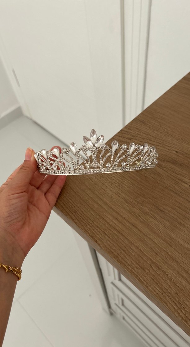 Beyaz metalden yapılmış, parlak taşlarla süslenmiş bu gelin tacı, klasik ve gösterişli bir şıklık sunar. Hafif renk ve geleneksel tasarımıyla zamansız bir aksesuardır. Kendi düğünümde kullandım sadece ben çok memnun kaldım.