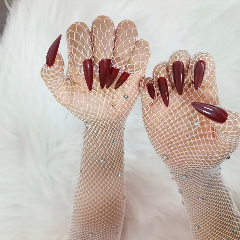 Uzun, sivri tasarımlı parlak bordo tırnak süslemeleri ile tırnaklarınıza dikkat çekici bir görünüm kazandırır.