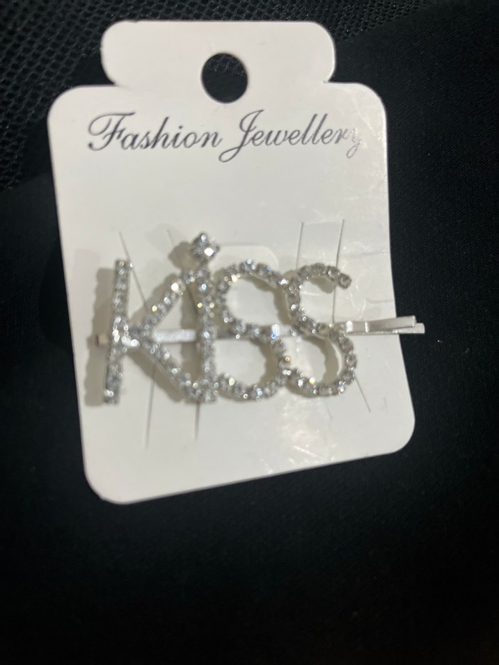 Gri renkli, metalden yapılmış ve 'KISS' yazılı taşlı saç tokası. Parlak ve rock punk tarzını yansıtan bir aksesuar.