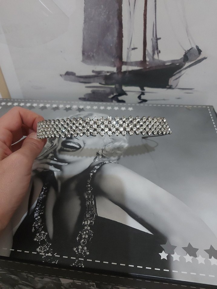 Gri renkli, parlak metal malzemeden yapılmış taşlı gelin tacı. Göz alıcı bir tasarım. ✨