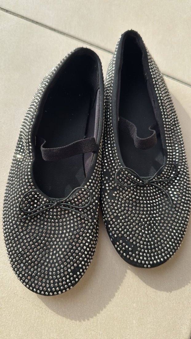 Siyah dolgu topuklu kadın babet, parlak taşlarla kaplı. Gotik ve Paris tarzını yansıtan şık bir model. ✨