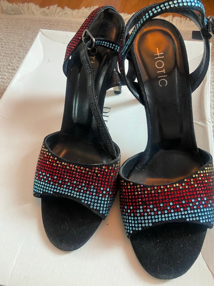 Siyah yüksek topuklu stilettolar, çok renkli taş işlemeleri ve desenli tasarımıyla öne çıkar. Kauçuk tabanlı ve HOTiC markalıdır.