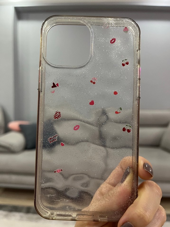 Pembe parlak telefon kapağı, dudak ve kiraz gibi küçük eğlenceli desenlerle süslenmiş, parlak yüzeye sahip. Counterculture tarzı için uygun.