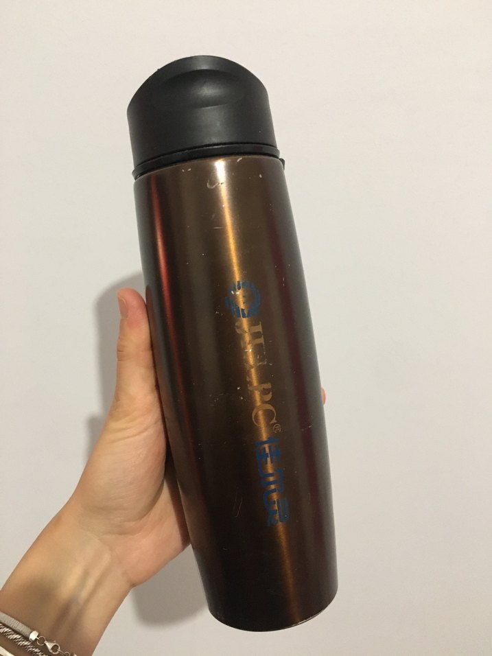 Parlak bej renkte, siyah kapaklı çocuk termos şişesi, içecekleri sıcak veya soğuk tutar. Okul ve dış mekanlar için uygundur.