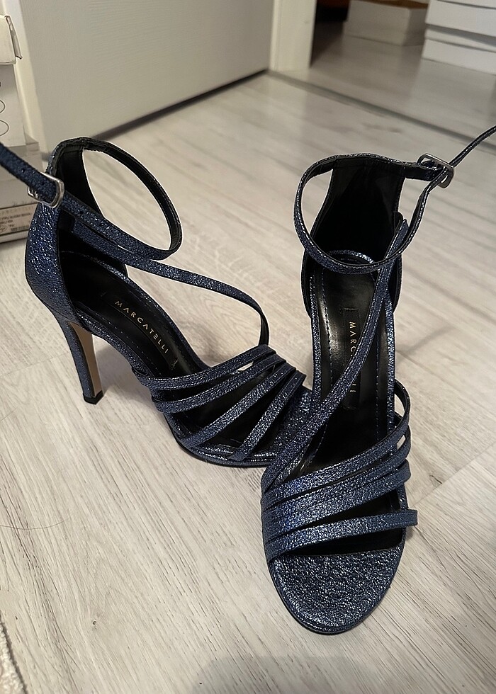Lacivert simli görüntü. Çok bantlı. 1 defa giyildi. Marcatelli üründür kalitelidir. Kusuru yoktur. Topuk 9 cm