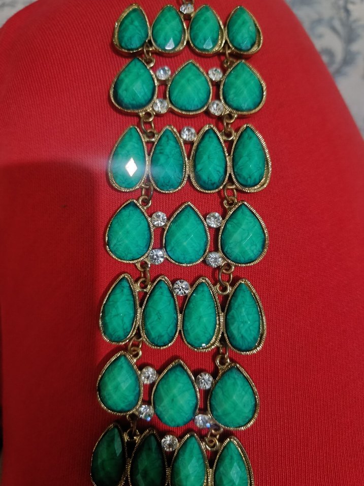 Parlak turkuaz damla boncuklar ve küçük şeffaf taşlarla süslenmiş, altın renk çerçeveli bohem tarz bileklik, düğünler için uygun.
