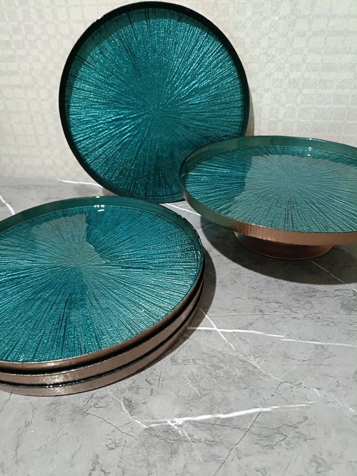 Parlak yüzeye sahip turkuaz tabak seti, çağdaş tarzda ve dokulu tasarımla sofranıza modern bir dokunuş katıyor. ️4 adet tabağı 1 adet ise ayaklı sunumluğu mevcut yenidir kullanılmadı fakat kutusu atıldı