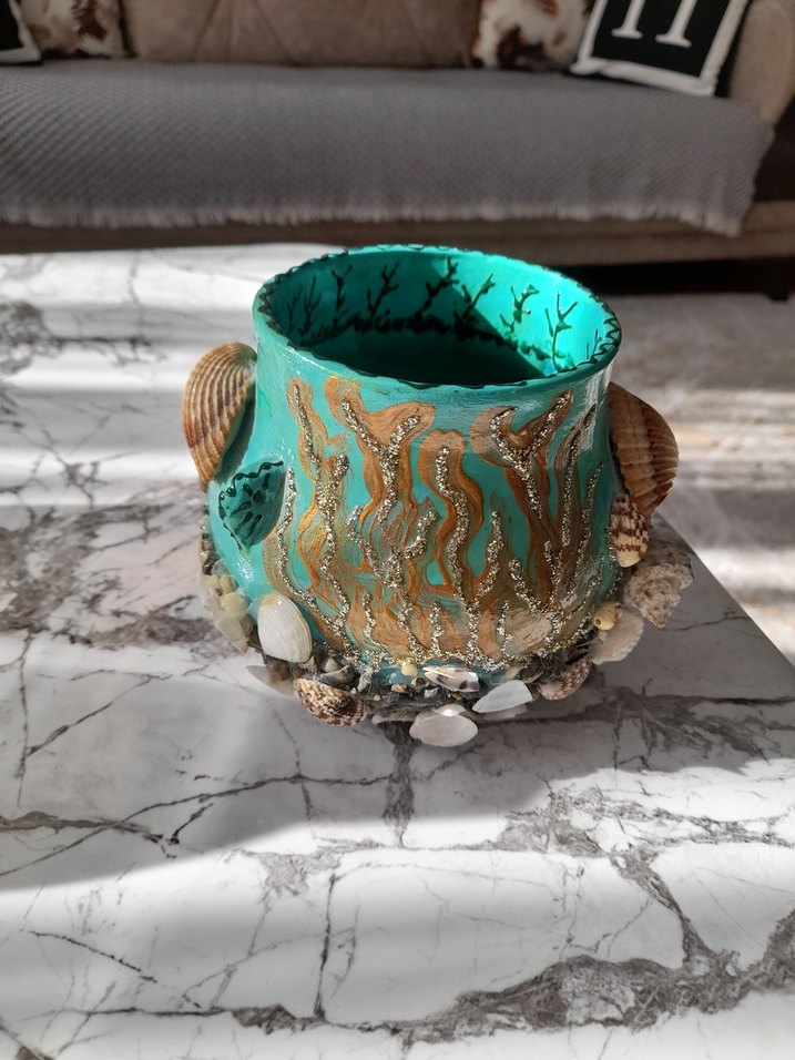 Parlak turkuaz renkte, deniz kabukları ve mercan desenleriyle süslenmiş vazo. Doğal unsurlar içeren dokulu tasarımıyla sahil atmosferi yaratır,boy 12 cm,çap 42 cm