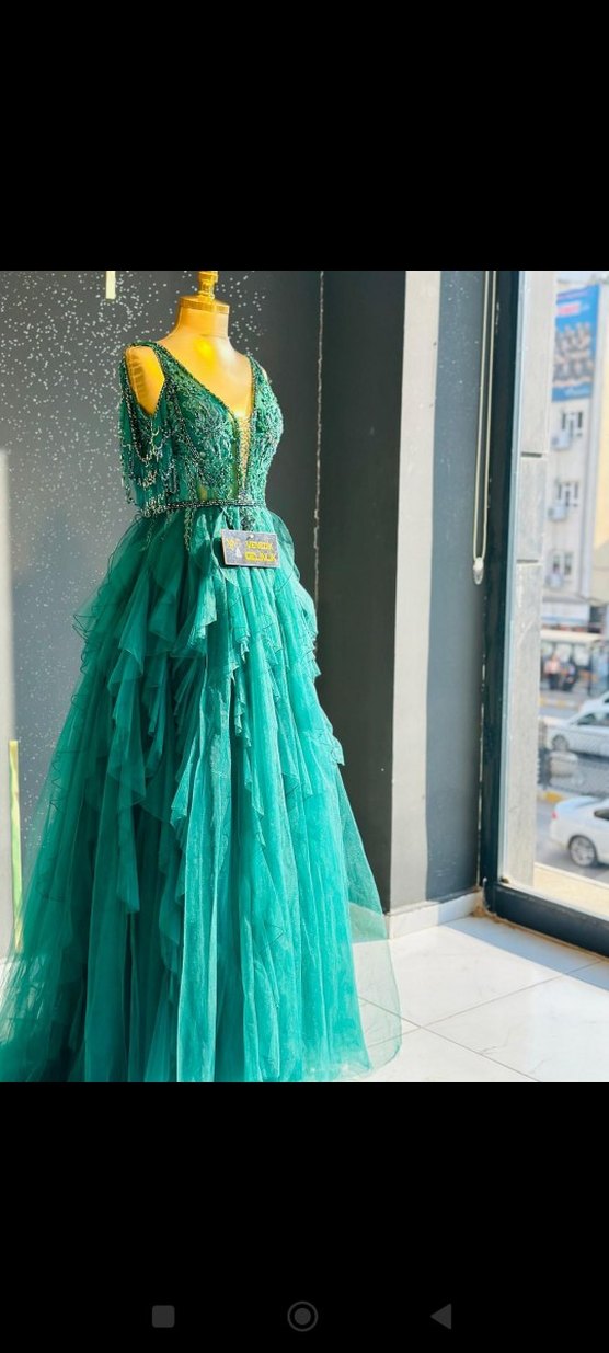 Parlak turkuaz renkte, drapeli ve desenli uzun, vücuda oturan nişan elbisesi. Kolsuz ve V yakalı, şık ve bohem tarzları bir arada sunar.