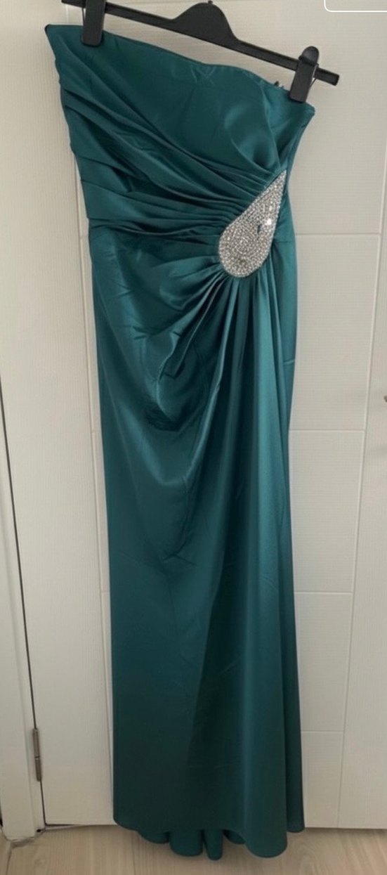 Bu dar kesim, straplez abiye elbise, drapeli detaylara ve parlak turkuaz renge sahiptir. Düğünler için uygundur, kolsuz ve modern klasik tarzda, göz alıcıdır.