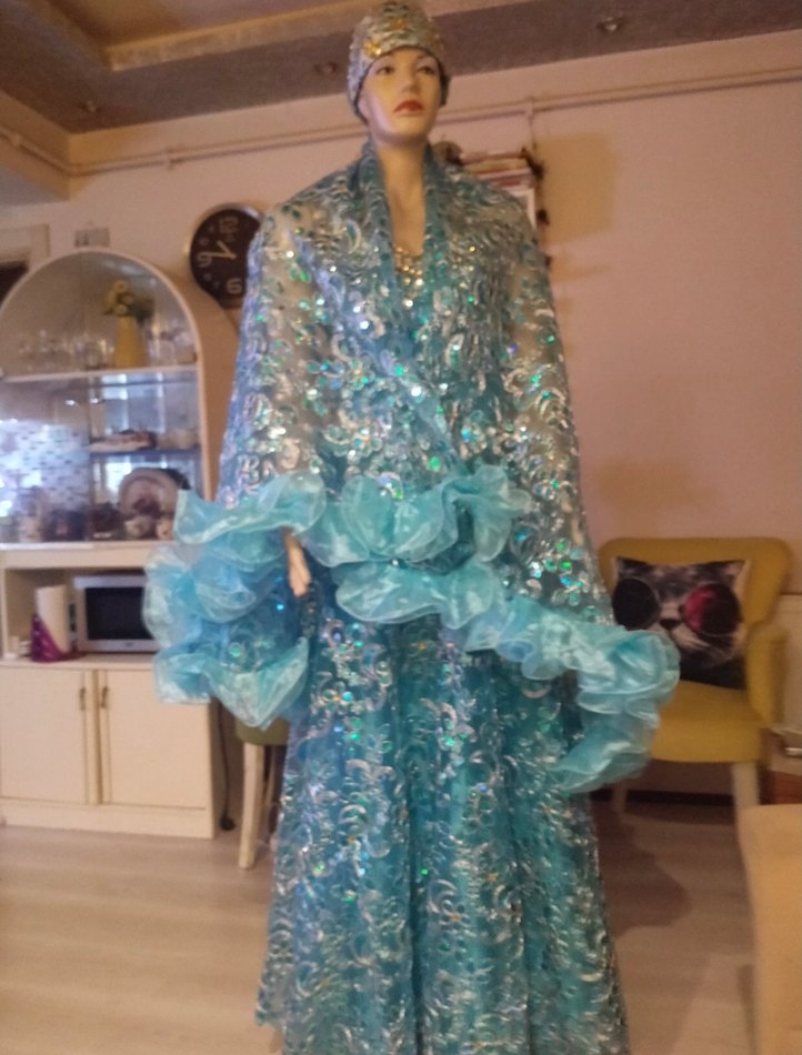 Parlak turkuaz tie-dye desene sahip, drapeli ve fırfırlı uçlu bol kesim, straplez uzun bohem abiye elbise.