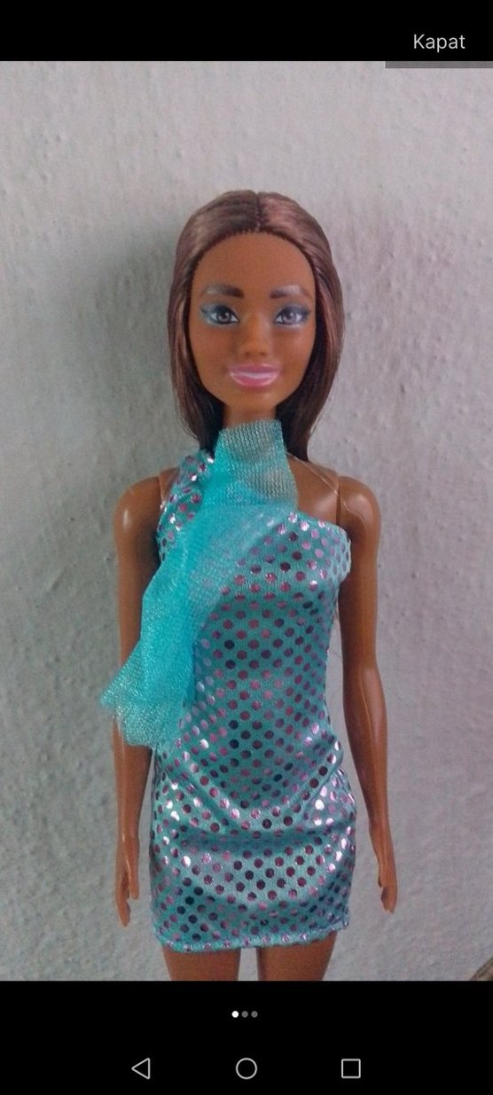 Parlak turkuaz renkli, puantiyeli ve tek omuzda kabarık detaylı elbise giymiş bebek. Sadece kutusu yırtıldı çıkartıldı oynanmado sıfır