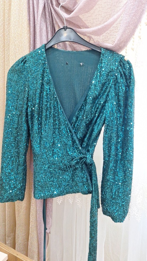 Parlak turkuaz bluz, uzun kollu ve V yakalı, kısa boy ve vücuda oturan kesimde. Parti için bohem tarzda uygun. ✨