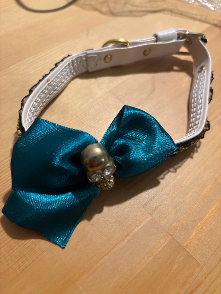 Parlak turkuaz fiyonklu ve kurukafalı, beyaz ayarlanabilir kayışlı kedi köpek tasma.