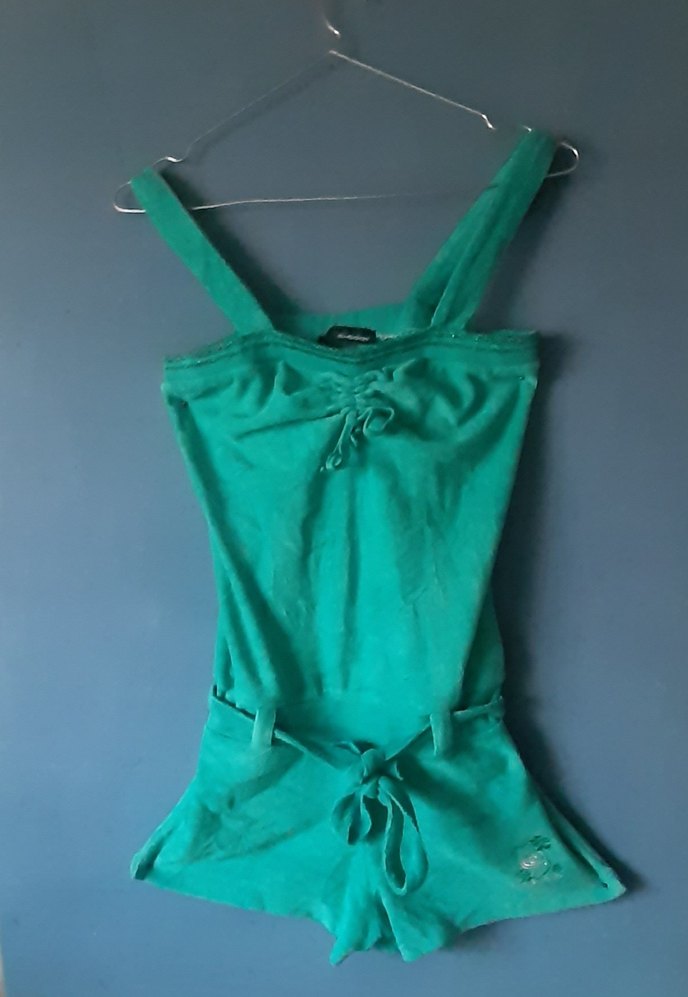 Dar kesim, askılı ve straplez yakalı kadın tulumu. Kemer detaylı, parlak turkuaz renkte ve yumuşak keten kumaştan yapılmıştır. Midi boyda, sokak stiline uygun.