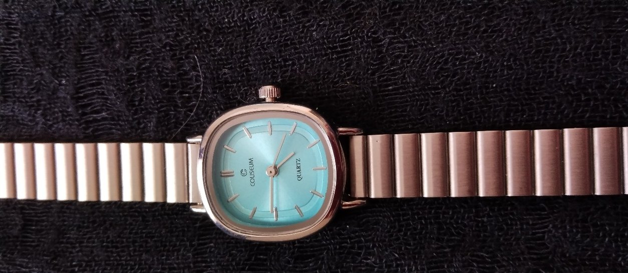Parlak turkuaz kadranlı, modern klasik tasarımlı kadın kol saati. Tokalı kayışı ve kare şeklinde kasası vardır. ⌚