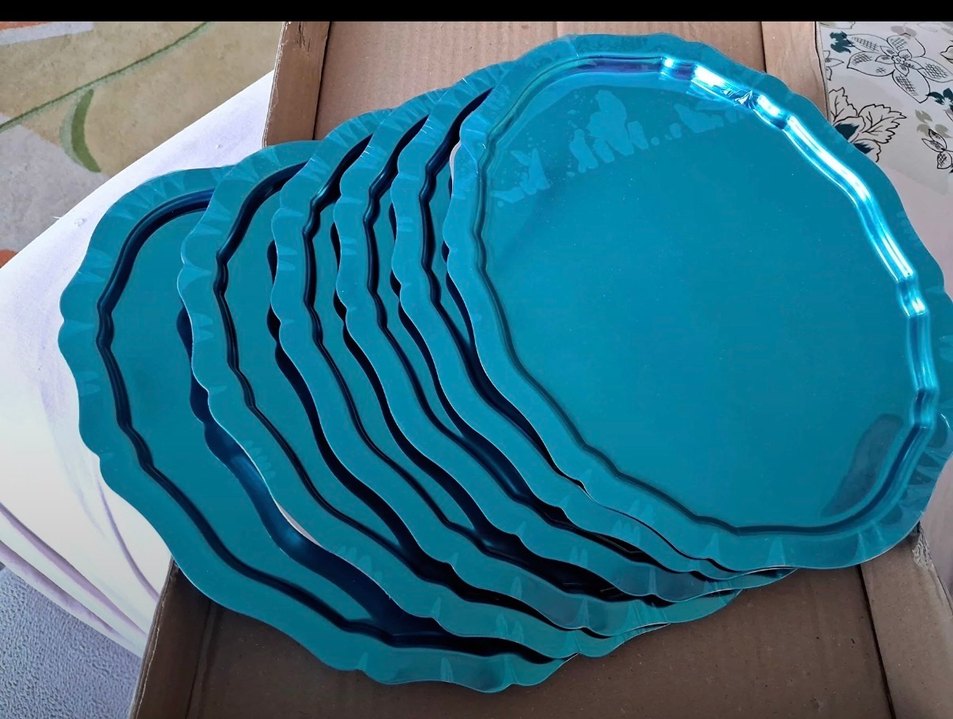 Parlak turkuaz renkte, soyut ve modern desenli tabaklar. Dalgalı kenarlarıyla dikkat çeker. ️ Sadece 2 adet mevcuttur.