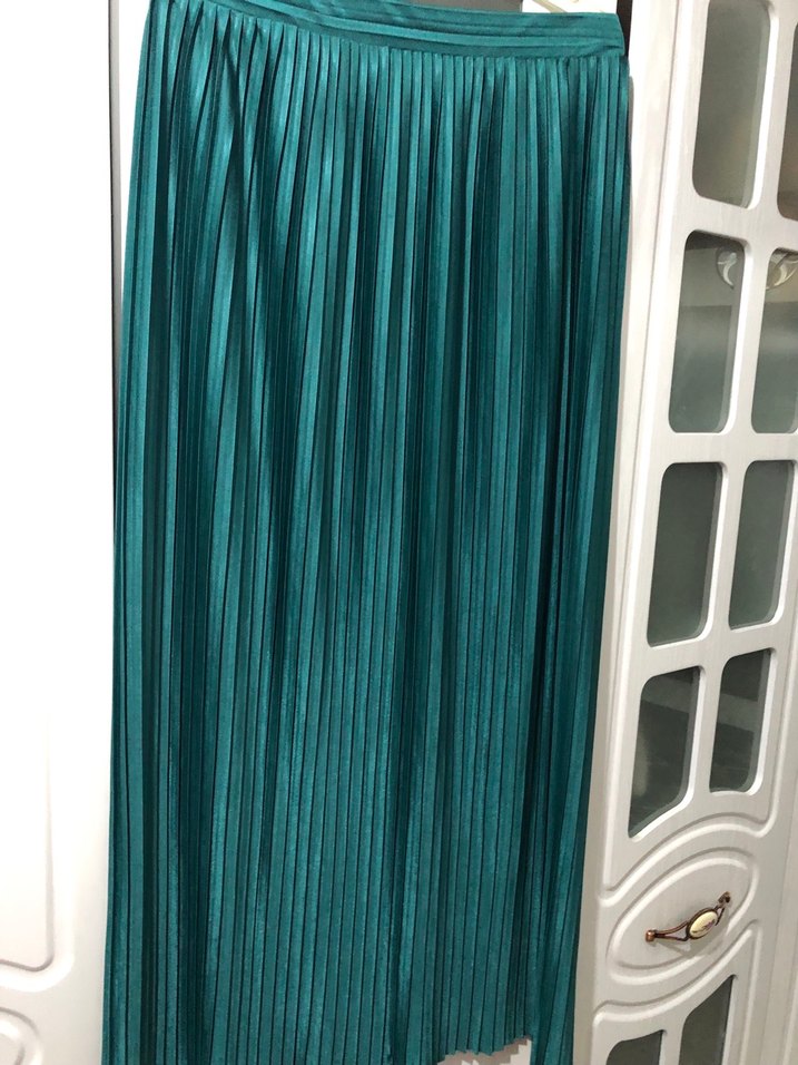 Parlak turkuaz renkli, pileli sentetik kumaştan yapılmış, bohem Paris tarzını yansıtan dar kesim uzun etek.