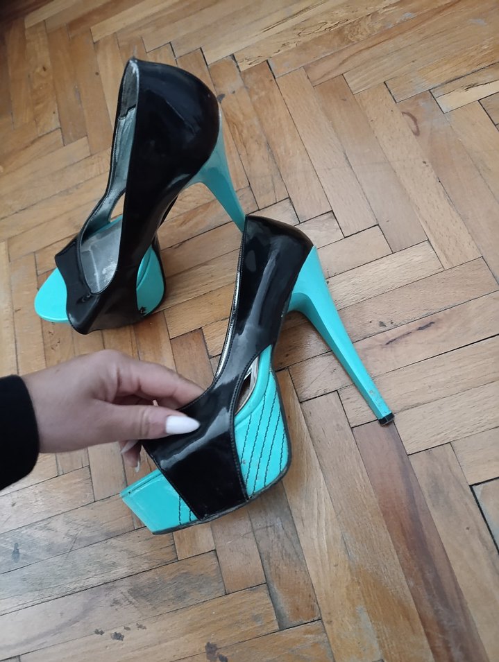 Parlak yüzeye sahip turkuaz platform topuklu stiletto, koyu desenli detaylarla cesur ve çağdaş parti stilleri için uygun.