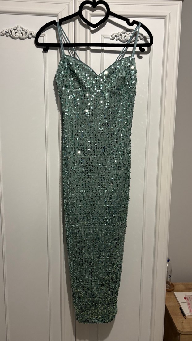 Parlak Turkuaz Pul İşlemeli Uzun Abiye Elbise