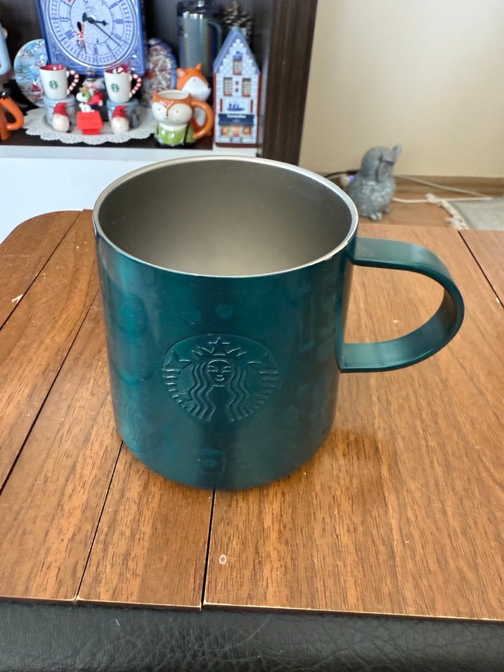 Parlak turkuaz renkte, üzerinde kabartma Starbucks logosu olan 50. Yıl Kupası termos bir kupa. ☕ #starbuckskupa #starbucks #kupa #stanley