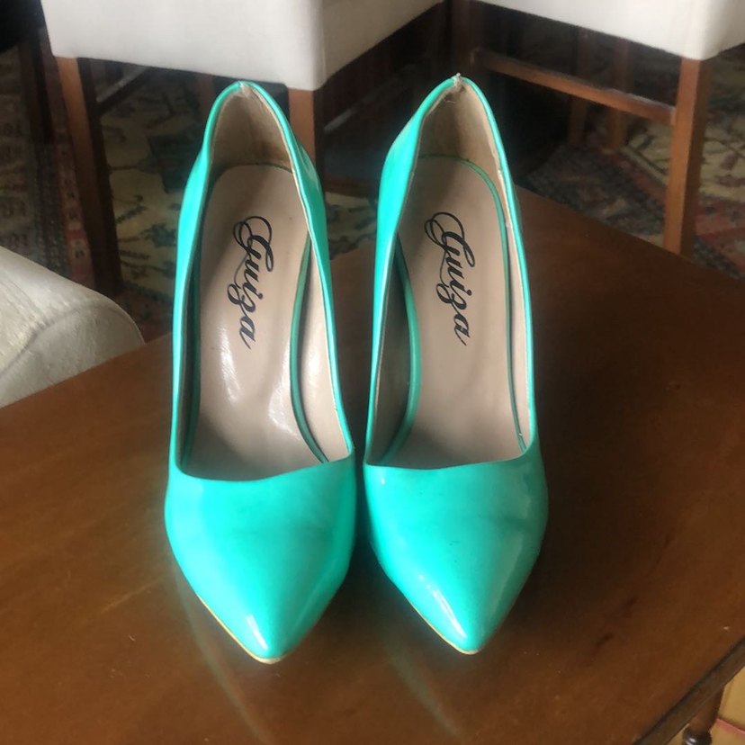 Parlak turkuaz renkli, baskılı ve kauçuk malzemeden yapılmış stiletto topuklu ayakkabılar, cesur sokak stili için uygundur. İç kısmında "gusa" markası yer alır.