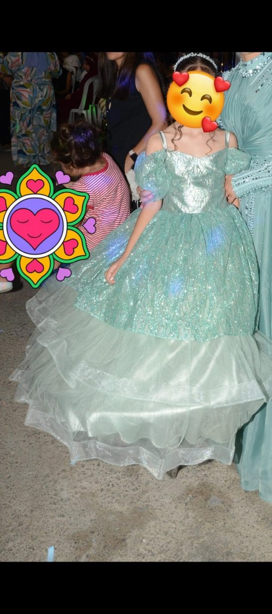 Parlak detaylı, turkuaz straplez ve askılı, işlemeli desenli, yumuşak sentetik kumaştan yapılmış, şık kesimli kız çocuk abiyesi. ✨