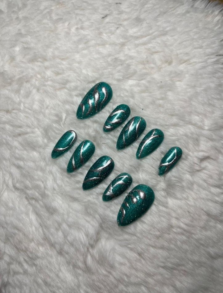 Parlak turkuaz renkte, gümüş çizgi desenli 10 adet tırnak süsü. Canlı ve şık bir görünüm sağlar.