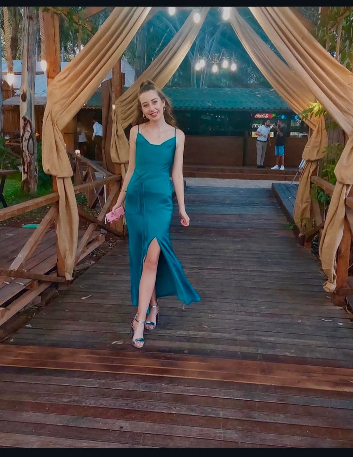 V yakalı, askılı, parlak turkuaz renkte, satenimsi kumaştan, drapeli ve vücuda oturan uzun elbise. Parti için uygun, cesur sokak stili dokunuşu içerir.