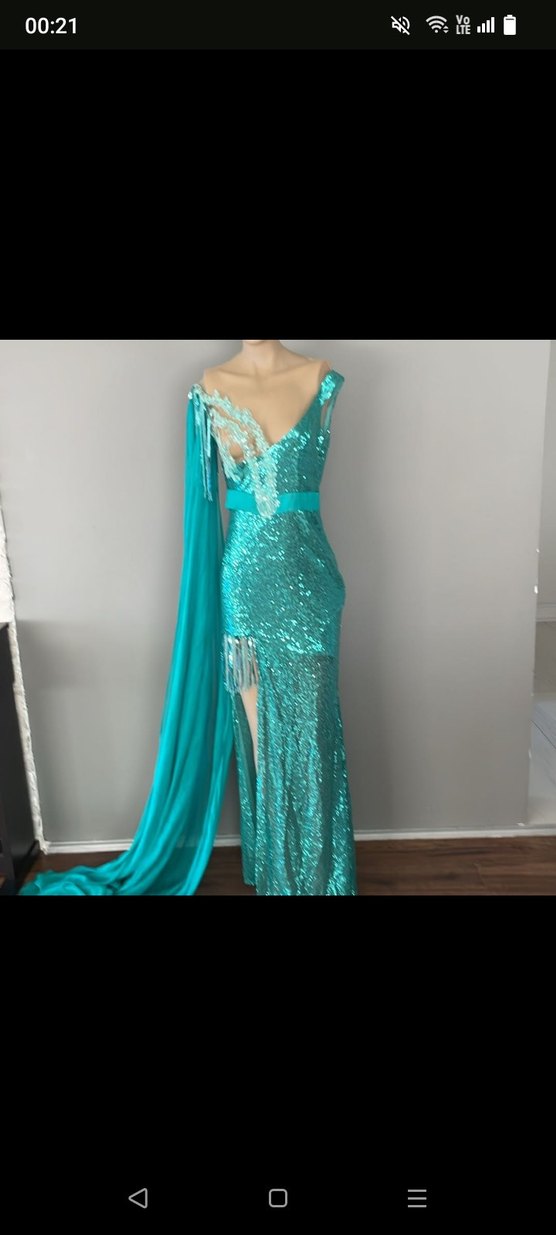 Parlak desenli, turkuaz renkli, uzun ve drapeli, straplez ve vücuda oturan abiye elbisedir. ✨