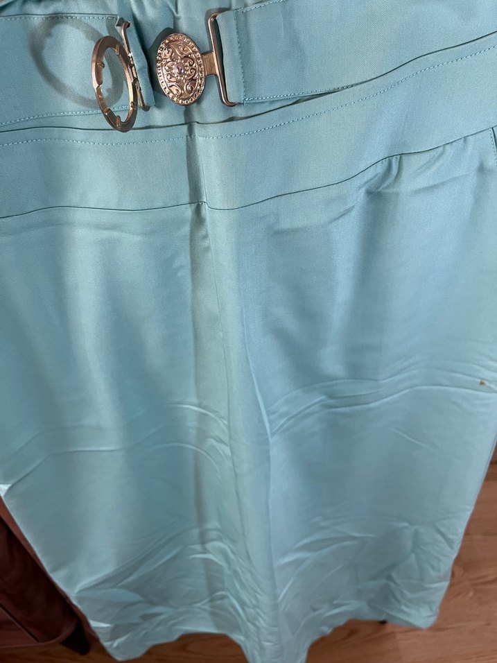 Parlak turkuaz saten kumaştan, kemerli ve vintage tokalı, uzun kesim, vücuda oturan hamile eteği. Düz ve şık görünüm sunar.