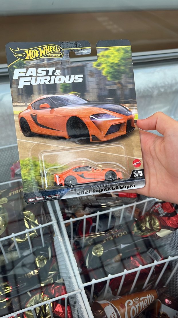 Hot Wheels Fast & Furious serisinden 2021 Toyota GR Supra model parlak turuncu oyuncak araba. Detaylı tasarım ve pürüzsüz tekerlekler içerir.