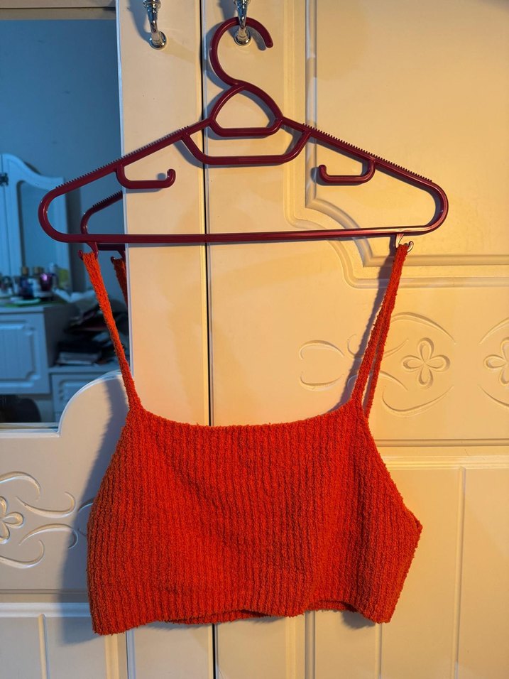 Parlak turuncu renkte havlu dokulu crop top. Günlük kullanıma uygundur.