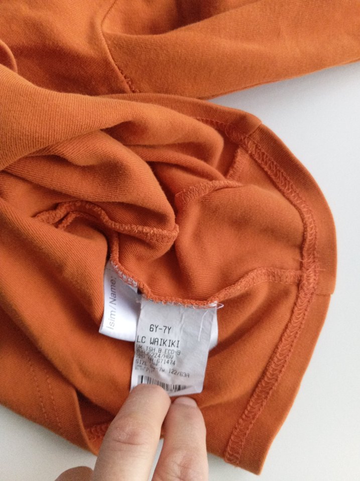 Parlak turuncu renkte, baskılı desene sahip bu bebek önlüğü 6-7 yaş çocuklar için uygundur. LC Waikiki markasına aittir. 6 yaş