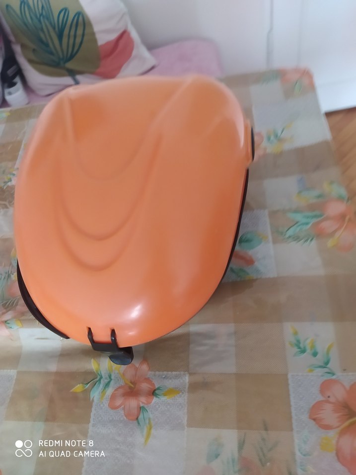 Parlak turuncu plastikten yapılmış, baskılı avant-garde tasarıma sahip motosiklet kutusu, trend belirleyiciler için uygundur.