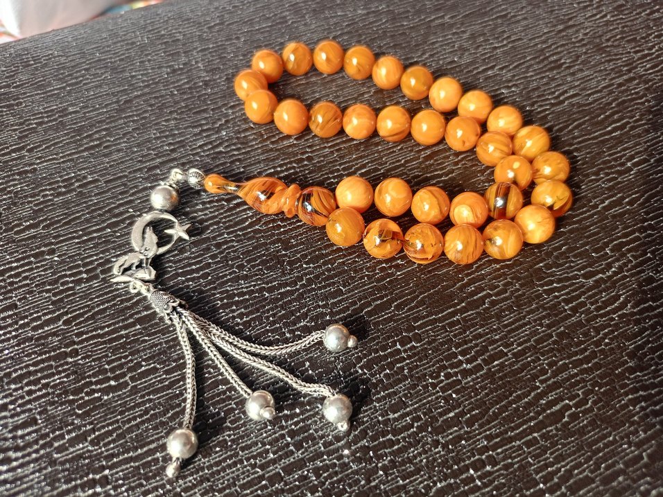 Parlak turuncu boncuklar ve gümüş püsküllerle bohem tarzı erkek tesbih. Canlı renk ve detaylı püsküllerle dikkat çeker.