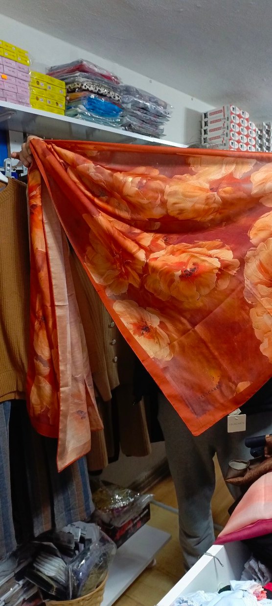 Parlak Turuncu zemin üzerine büyük çiçek desenleriyle, ipeksi dokulu, drapeli kadın fular, bohem tarzına uygundur.
