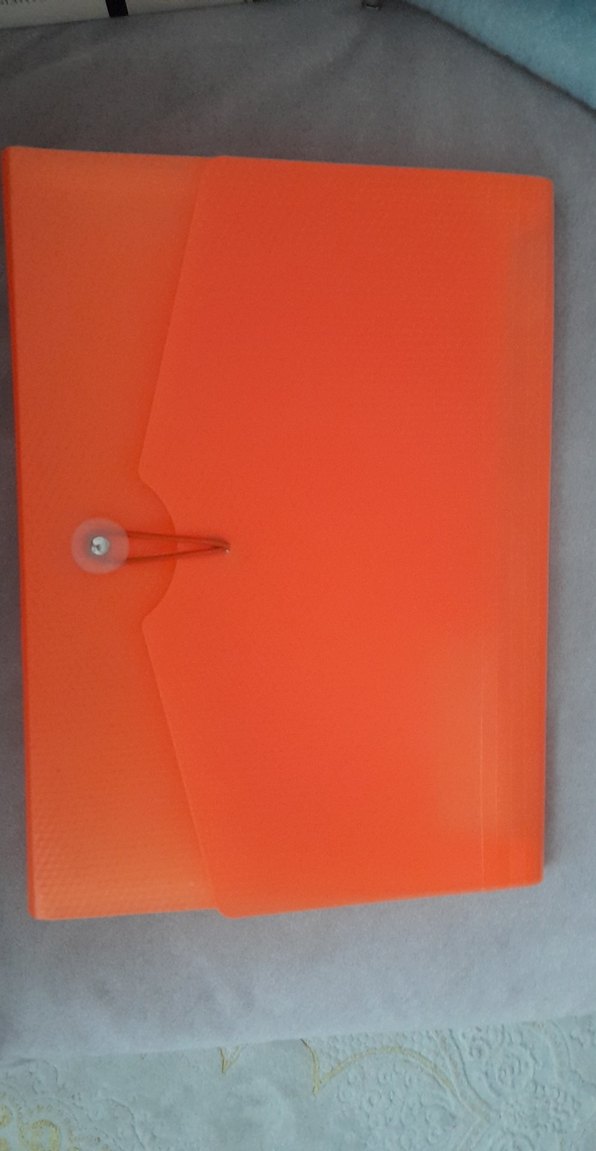 Parlak turuncu renkte, düğmeli kapaklı dosya, belgeleri düzenlemek için uygundur.