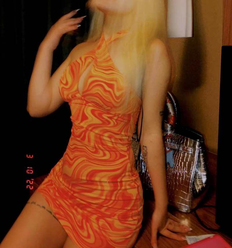 Parlak turuncu tie-dye desenli, straplez yaka ve ince askılı, drapeli midi elbise. Sentetik kumaştan, parti için uygundur. ✨