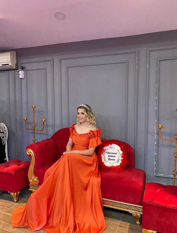 Parlak turuncu uzun abiye elbise, drapeli ve straplez yakalıdır. Bol kesim, askılı kollu ve baskılı desene sahiptir. Düğünler için uygundur. Yeşim Kafkas özel tasarımdır. Teklif iletebilirsiniz.
