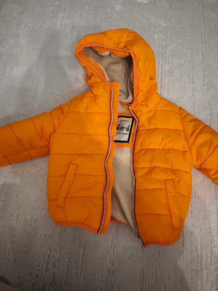 Parlak turuncu renkte, fermuarlı ve dar kesim erkek çocuk montu. Notlu yaka ve yumuşak, sıcak tutan iç yüzeyiyle sokak giyimine uygun.