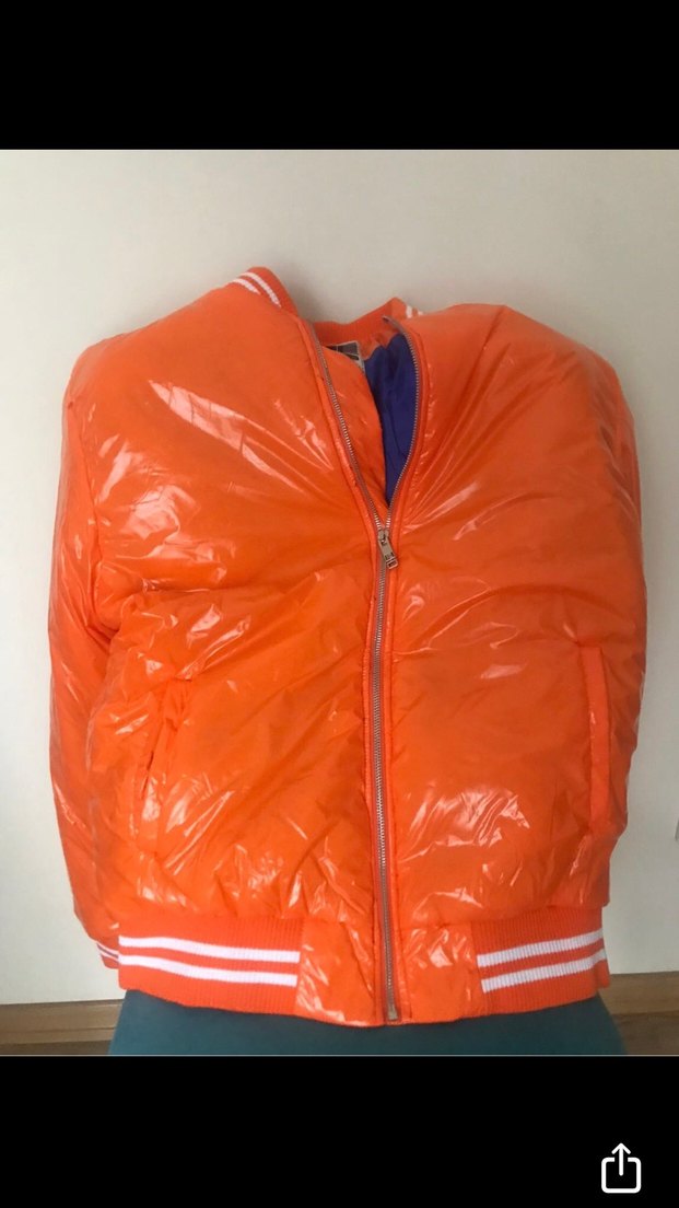 Parlak turuncu renkte, fermuarlı ve yüksek yakalı . Uzun kollu, normal midi boyunda, sokak modası ve athleisure tarzı bir tasarım.