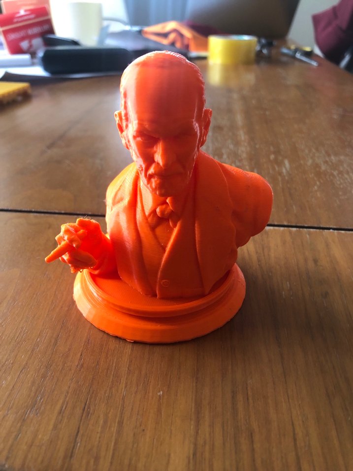 Parlak turuncu renkte, elinde küçük bir nesne tutan takım elbiseli adam figürini. Yuvarlak taban üzerinde, pürüzsüz yüzeye sahip.