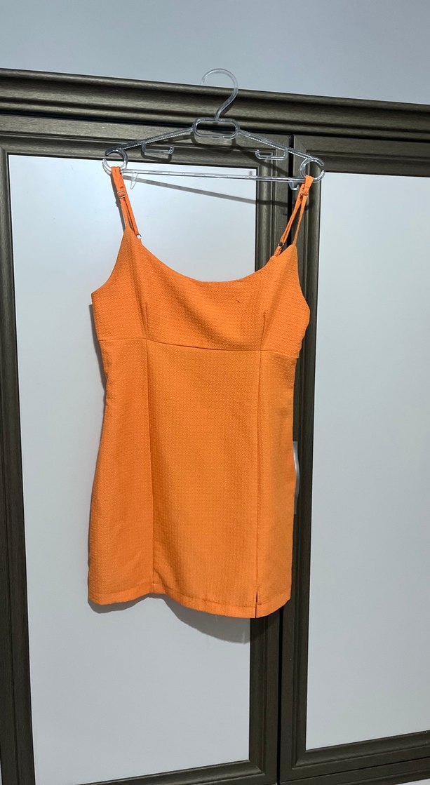 İnce askılı, parlak turuncu sentetik kumaştan yapılmış, vücuda oturan mini elbise. Minimalist ve şık tasarımıyla günlük kullanıma uygundur.