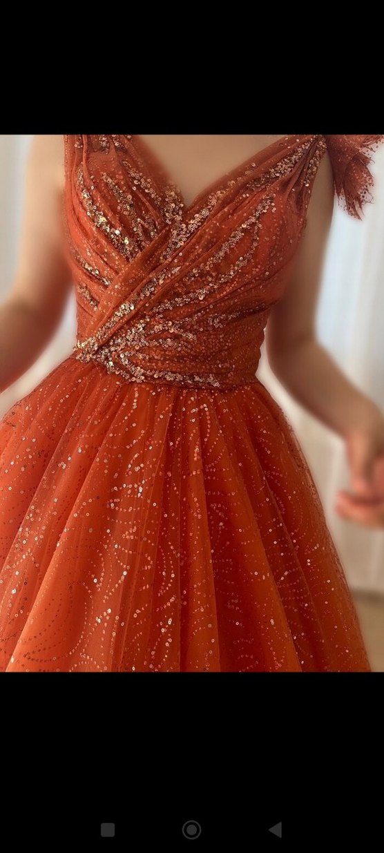 Parlak Turuncu Mini İşlemeli V Yaka Elbise