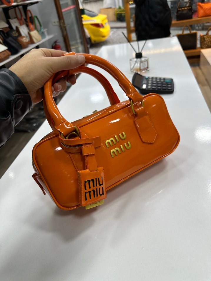 Miu Miu markalı, parlak turuncu deri çanta, baskılı logo ve şık sokak stili tasarımına sahiptir, günlük kullanım için uygundur.