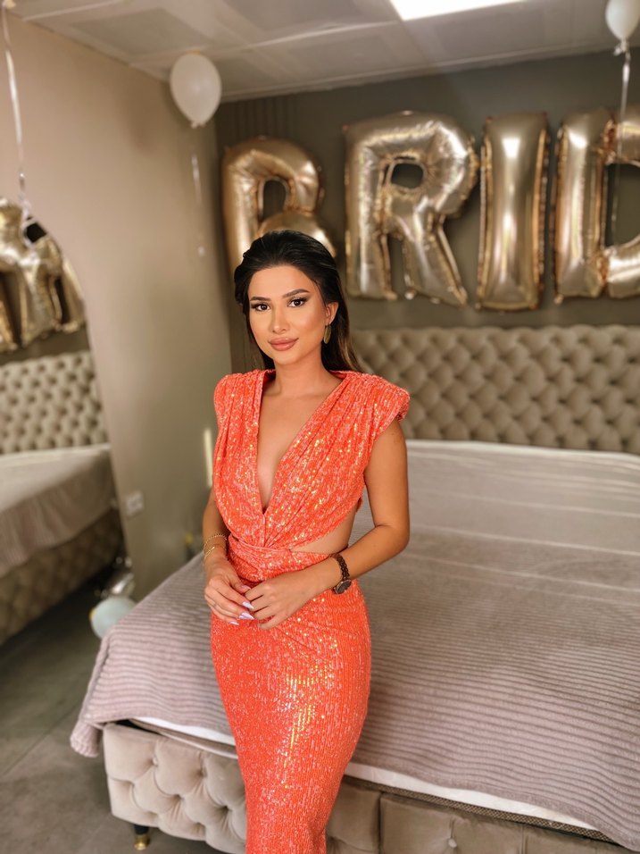 Parlak Turuncu payet Uzun Abiye Elbise