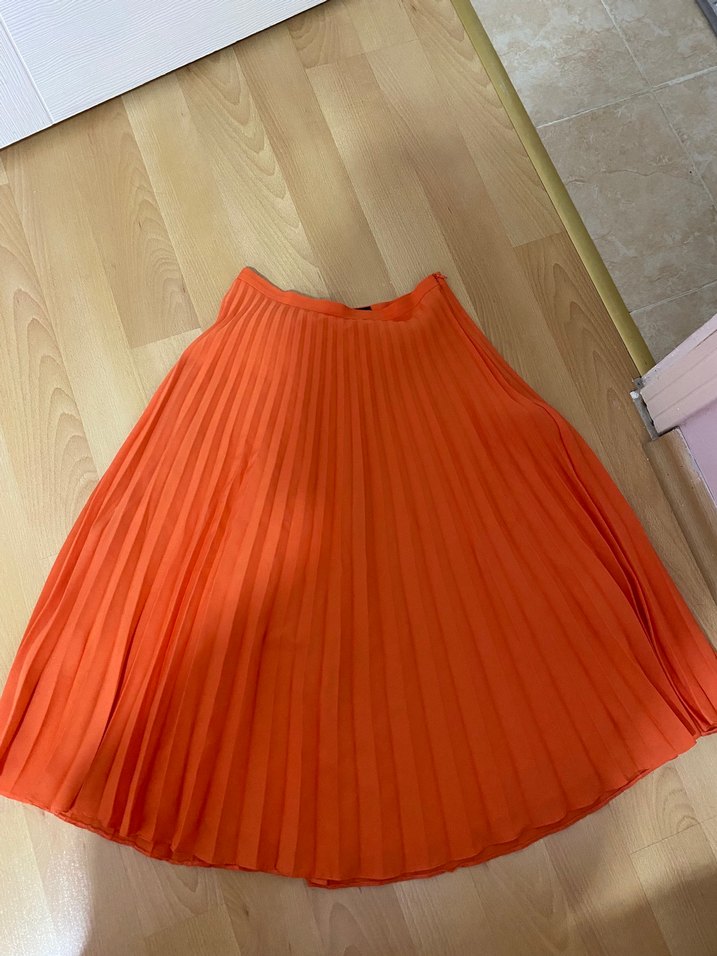 Parlak turuncu midi etek, pileli tasarımı ve bol kesimiyle sentetik kumaştan üretilmiştir. Günlük kullanıma uygundur, minimal ve trend bir görünüm sunar.