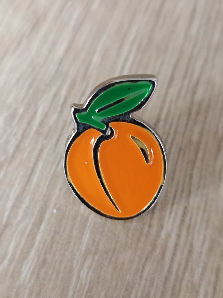 Parlak turuncu şeftali ve yeşil yaprak desenli, minimalist tarzda günlük kullanıma uygun broş. #rozet