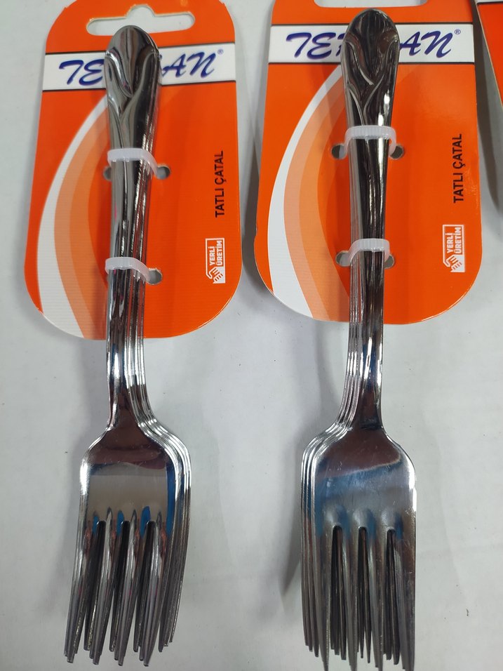 Parlak turuncu saplı, klasik tasarımlı 2 adet tatlı çatal. Ambalajda marka ve ürün bilgileri yer almaktadır.